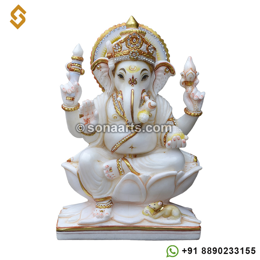 Ganapati Marble Moorti in makrana marble with color painting work. This Ganesh statue a perfect example of our mastery in marble statues.