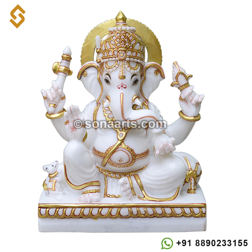 Ganesh Statue in White Marble in makrana marble with color painting work. This Ganesh statue a perfect example of our mastery in marble statues.