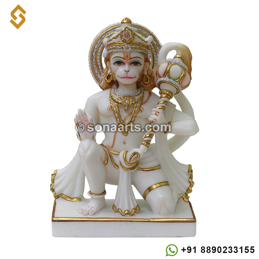 Marble Hanuman Stone Murti Price in seated posture in Makrana marble, which has been painted using 24CT gold foil, using idols for temple and worship.