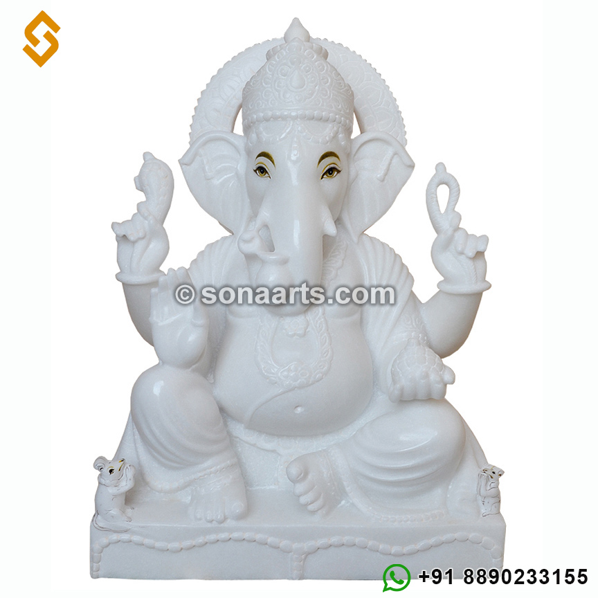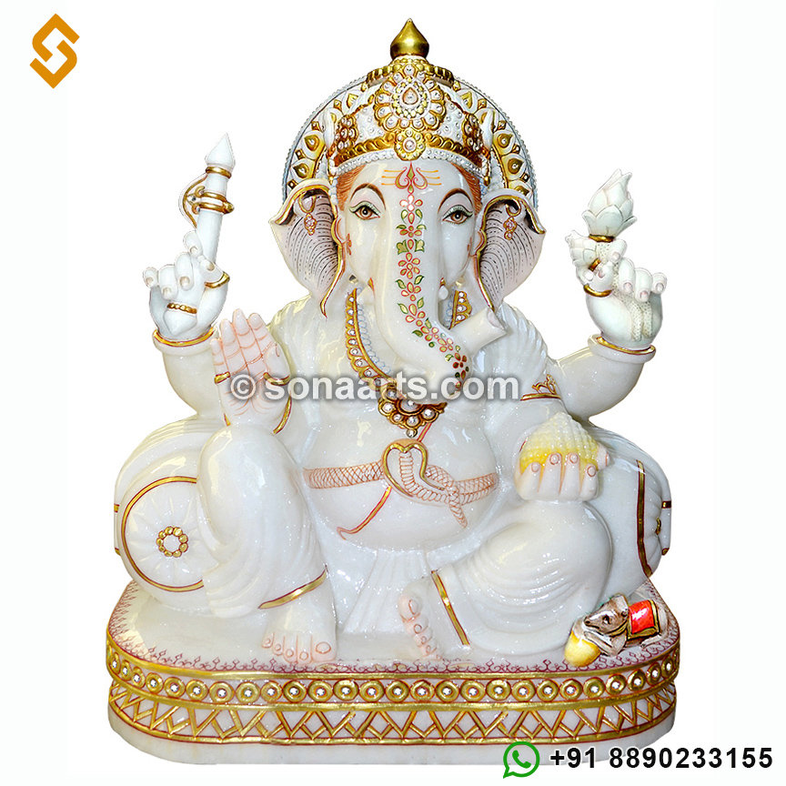 This beautiful Marble Ganesha Idol is carved out using premium quality white marble and decorated with painting work using real gold foil. this Beautiful Marble Ganesha Idol is presented in a sitting posture with four hands and use in office and home temple and as well as decoration purposes.