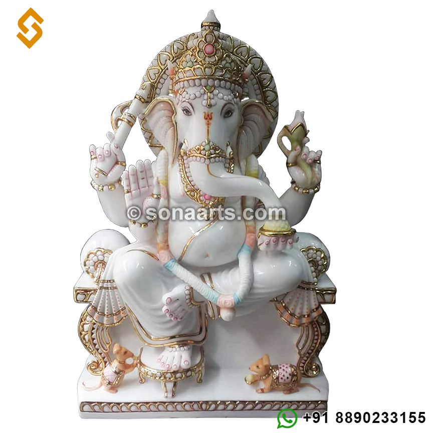 Designed to perfection, Marble Ganesh God Statues with Riddhi Siddhi are kept at various Hindu homes as a symbol of fortune, peace, happiness and prosperity. Ganesha sitting on lotus flower with Goddess Riddhi & Siddhi with him are placed on separate marble platforms.