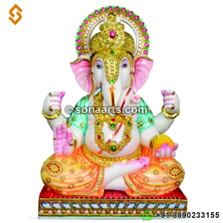 Marble ganesh murti with beautiful color and gold painting work in unique style. This is pure white spot free makrana marble with very fine facial expression.