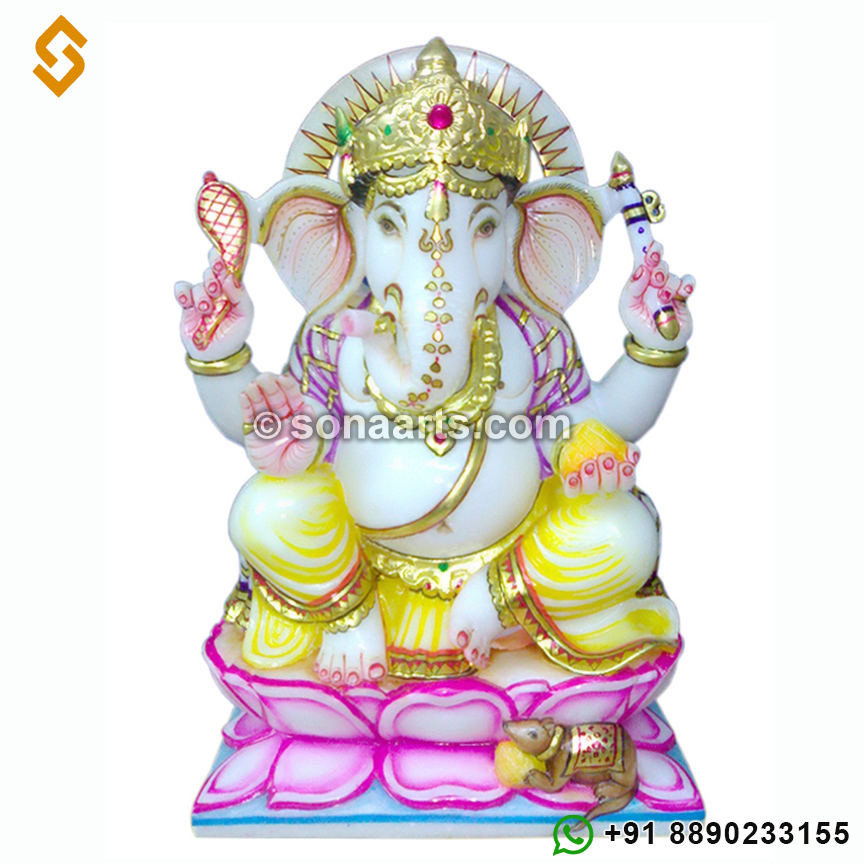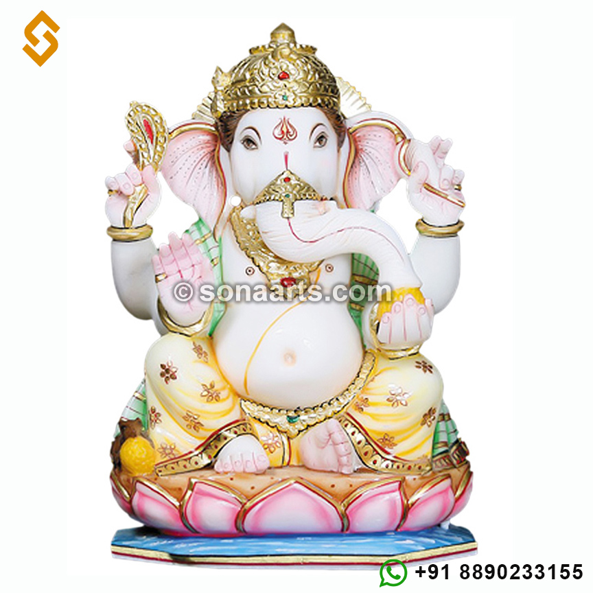 We manufacturer white Ganesh statue where ganesh ji is sitting with all his weapons in his hands. Sculpted from high quality white marble with unmatched workmanship.