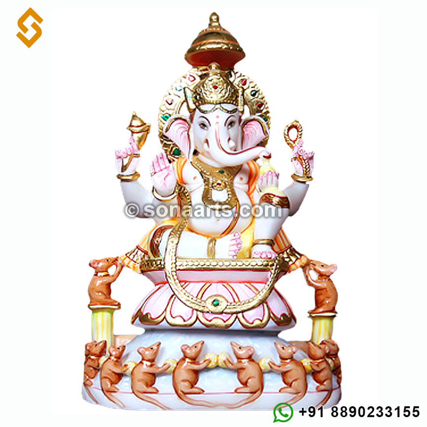 This Ganesh statue is Beautifully carved in pure white Makrana spot free marble with Beautiful hand painting work using 22 k real gold foil on the whole ornaments.