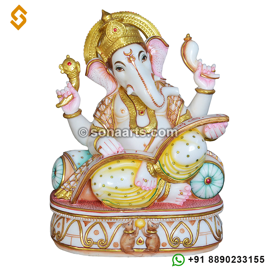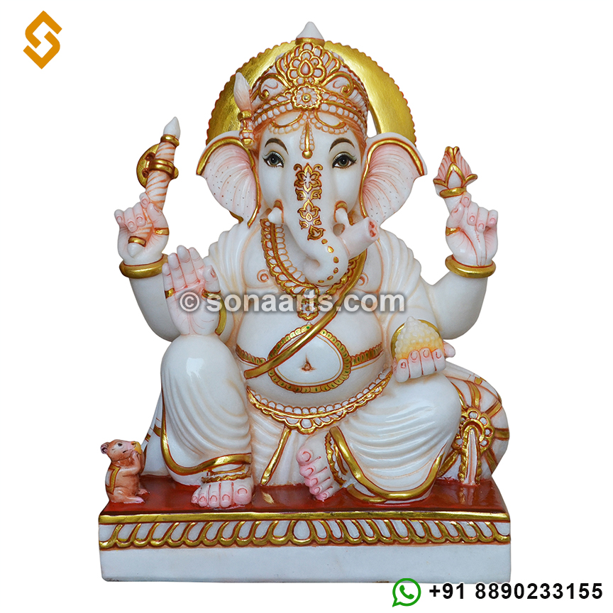 White Marble Lord Ganesha Statue in makrana marble with color painting work. This Ganesh statue a perfect example of our mastery in marble statues.