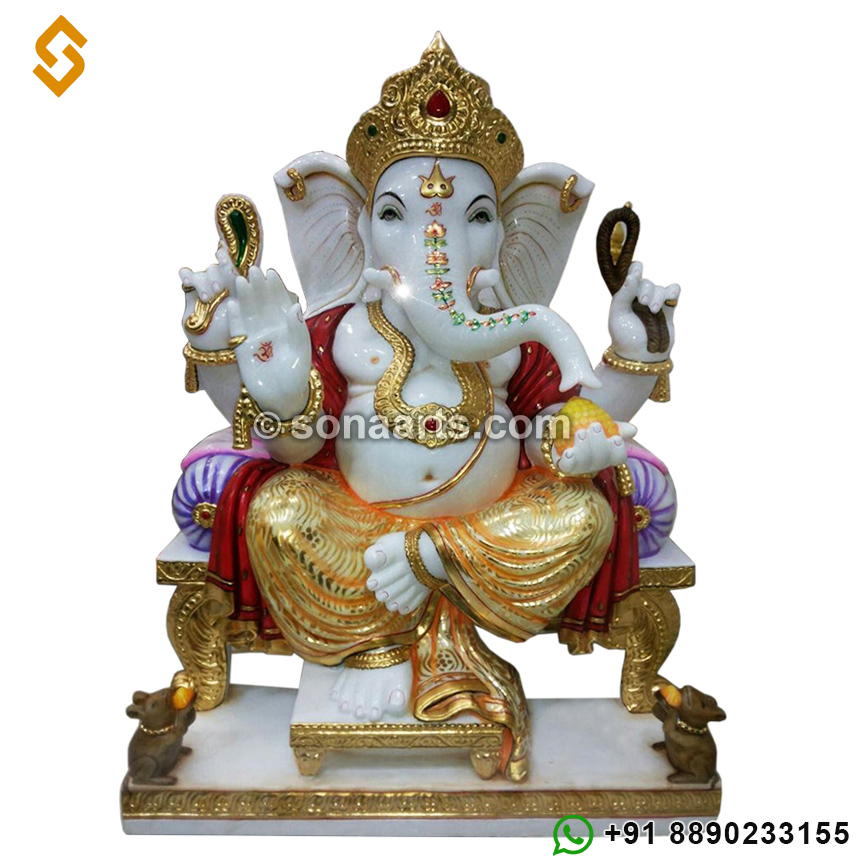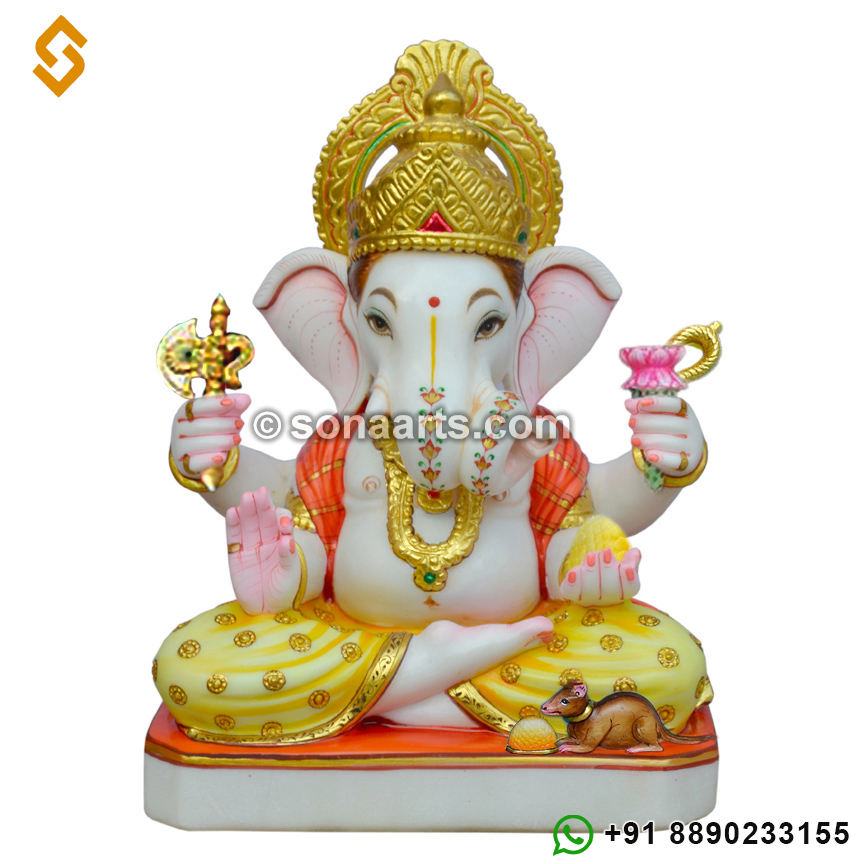 Designed to perfection, Marble Lord Ganesha Statue With Riddhi Siddhi are kept at various Hindu homes as a symbol of fortune, peace, happiness and prosperity. Ganesha sitting on lotus flower with Goddess Riddhi & Siddhi with him are placed on separate marble platforms.