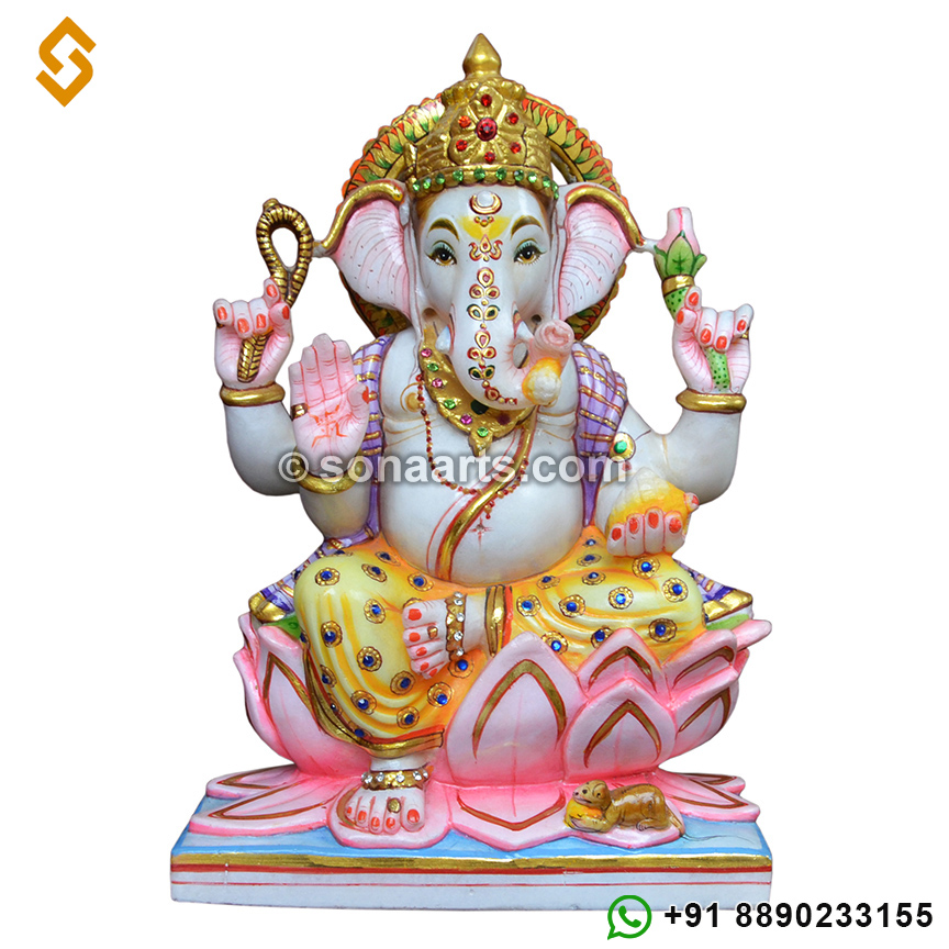 We manufacturer Marble Temple Ganesh Statue, where ganesh ji is sitting with all his weapons in his hands. Sculpted from high quality white marble with unmatched workmanship.