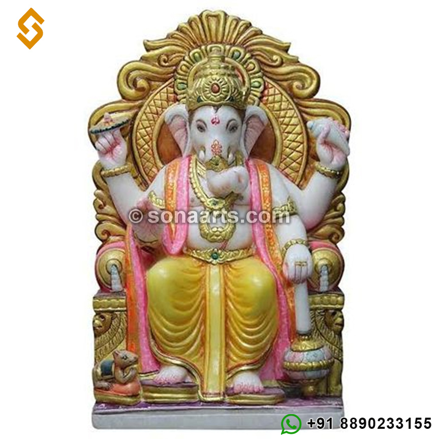 Marble ganesh statue with using golden color foil and fine quality color painting work to give brilliance look. These ganesh statue carved out from pure Makrana marble (the best quality marble of India) are the distinguished artifact for your interiors.
