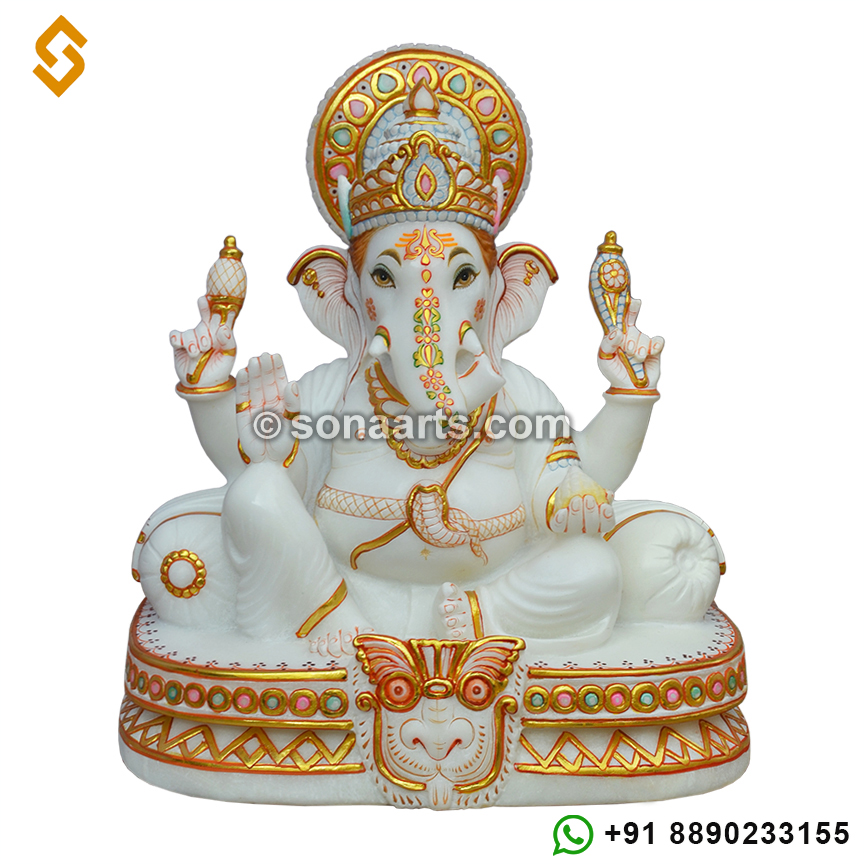 White And Gold Work Jaipur Marble Ganpati Murti - MSGN362